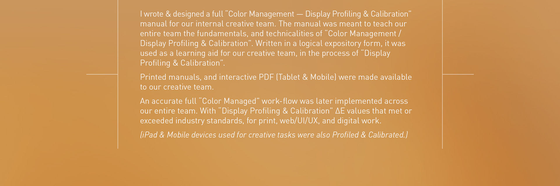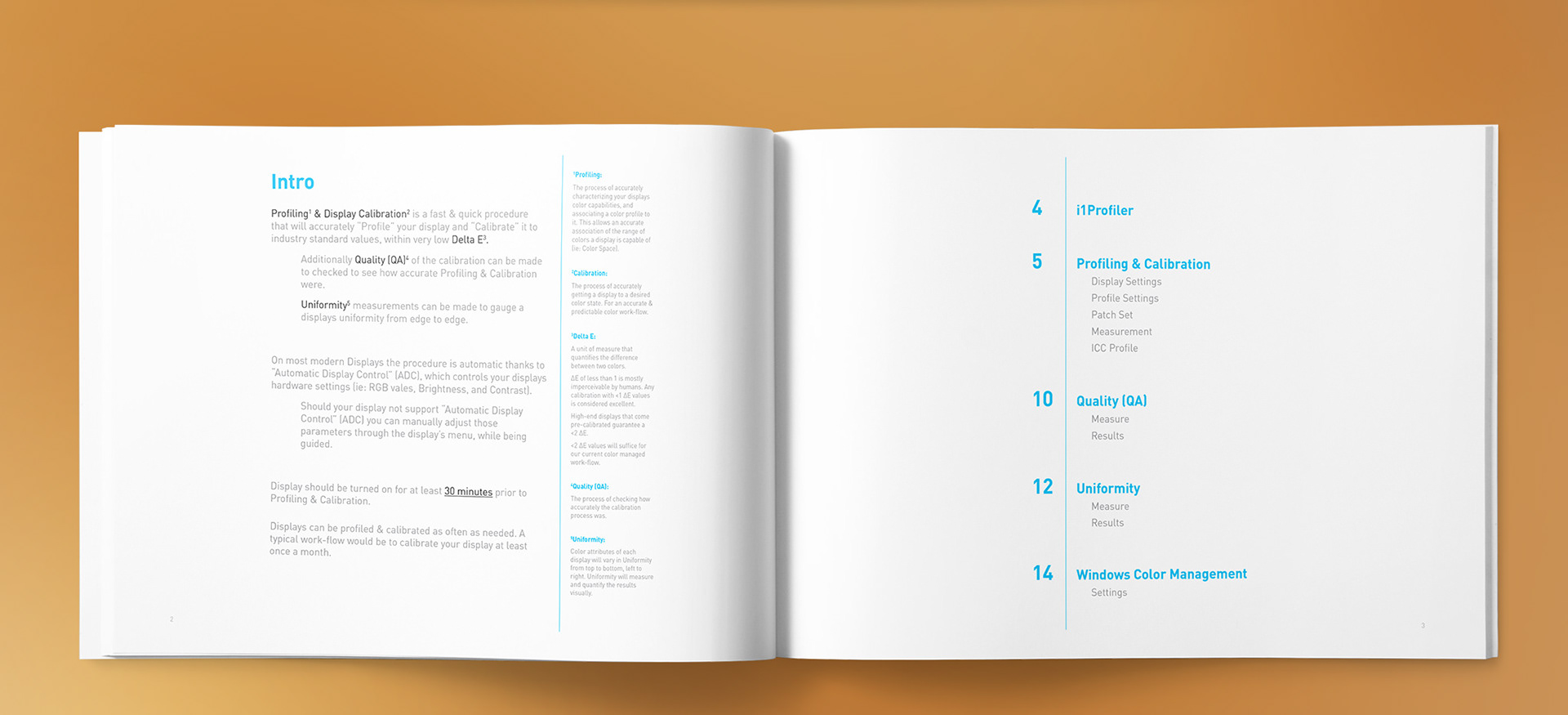 A written & designed manual on "Color Management — Display Profiling & Calibration". Designed for creative teams, for a full Color Managed workflow. Key Role: Writing, Concept, Design, and deployment of Color Managed workflow.